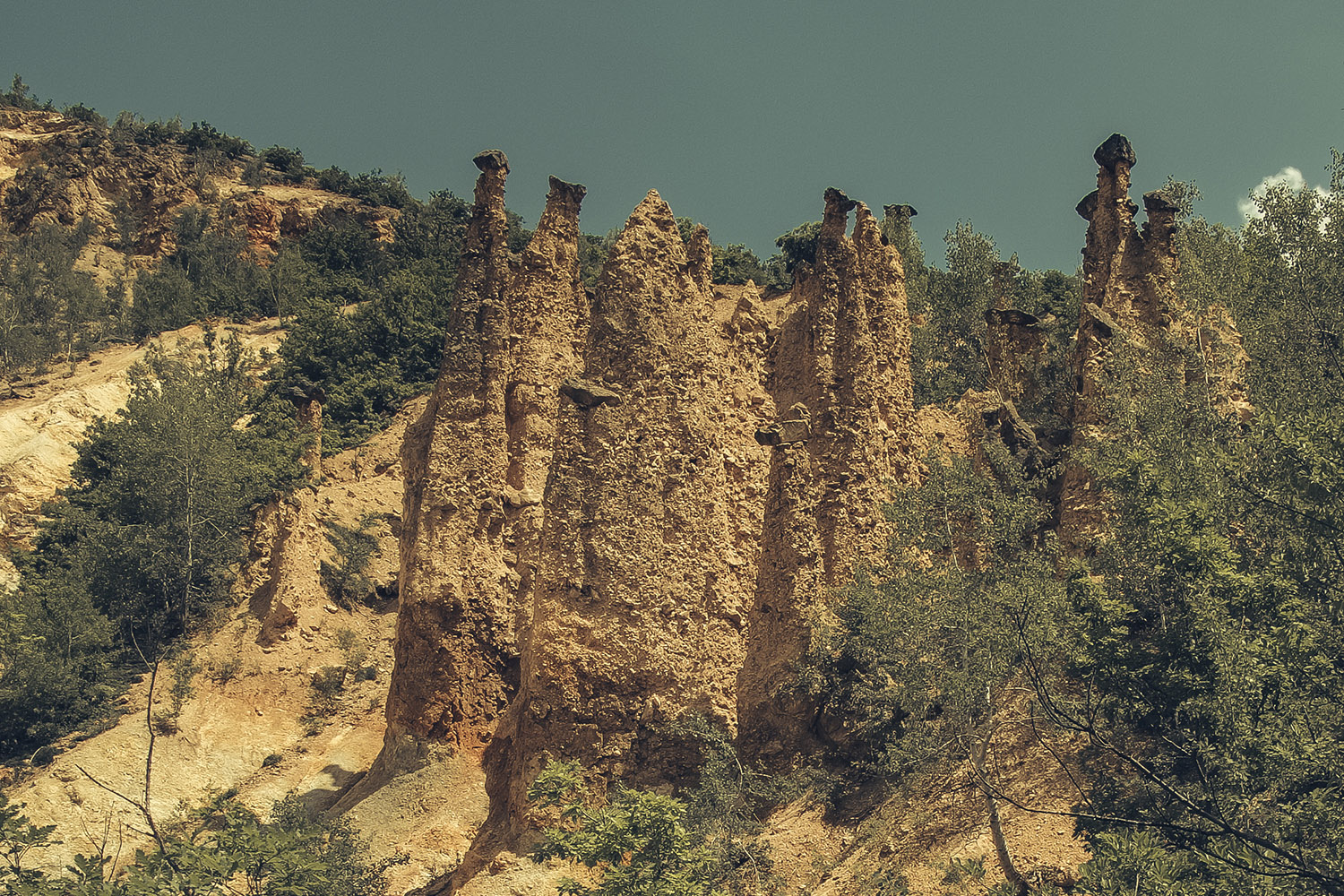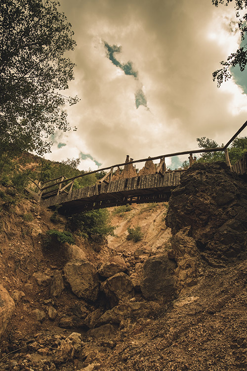 Al centro di questo paesaggio si ergono 202 figure di terra, alte da 2 a 15 metri, disposte nelle gole del Diavolo e dell’Inferno come una strana compagnia rimasta immobile nel mezzo di una conversazione. Con cappelli di pietra sulla cima, queste formazioni sembrano essersi riunite in un antico consiglio della natura e lì essere rimaste a custodirne il segreto.