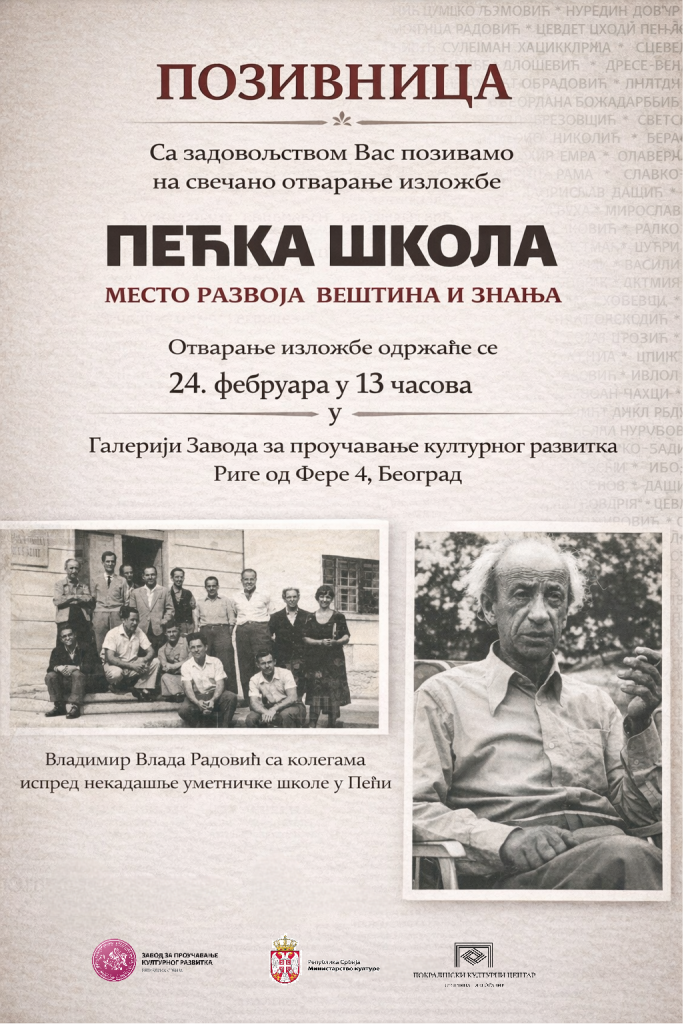 Завод за проучавање културног развитка ће у уторак, 24. фебруара са почетком у 13.00 часова бити домаћин свечаног отварања изложбе под називом „Пећка школа – место развоја, вештина и знања“, културно-уметничког и документарног пројекта посвећеног једној од најзначајнијих просветних и уметничких институција у Пећи и Метохији.