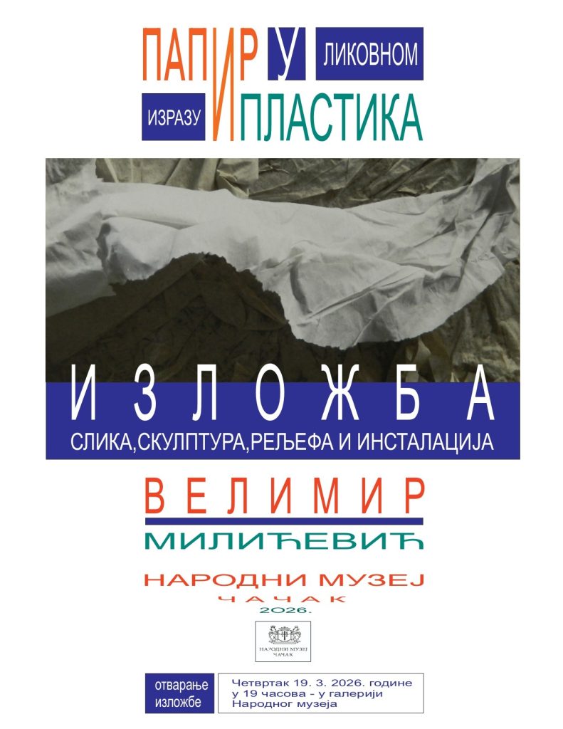 Самостална изложба сликара Велимира Милићевића „Папир и пластика у ликовном изразу“, биће отворена 19. марта 2026.године у 19 сати у Галерији Народног музеја.