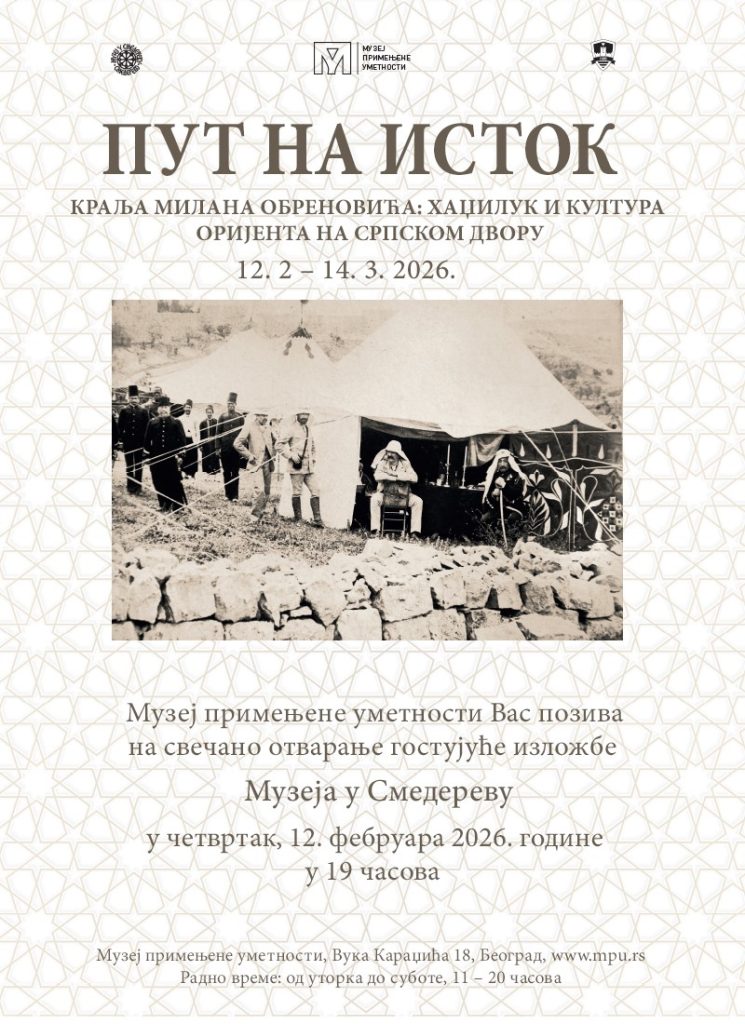 Свечано отварање изложбе „Пут на Исток краља Милана Обреновића: хаџилук и култура Оријента на српском двору“ је 12. фебруара 2026. године, у 19.00 часова, Главна галерија Музеја примењене уметности у Београду.