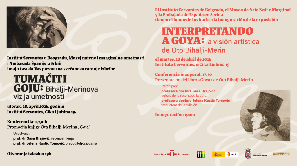 Институт Сервантес у Београду, Музеј наивне и маргиналне уметности и Амбасада Шпаније у Србији организују отварању изложбе „Тумачити Гоју: Бихаљи-Меринова визија уметности” која ће се одржати од 28. априла до 28. јуна.