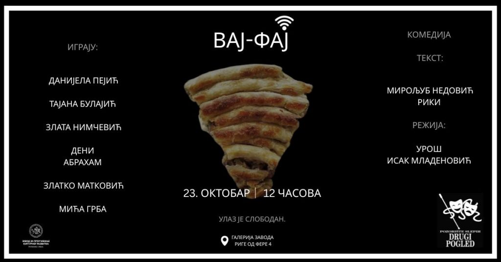 У четвртак, 23. октобра 2025. године у 12.00 часова, у Галерији Завода за проучавање културног развитка (Риге од Фере 4, Београд), биће изведена представа „Вај-фај“ Позоришта слепих „Други поглед“,која се реализује у оквиру пројекта Завода „Повећање приступачности културних садржаја за особе са инвалидитетом“.