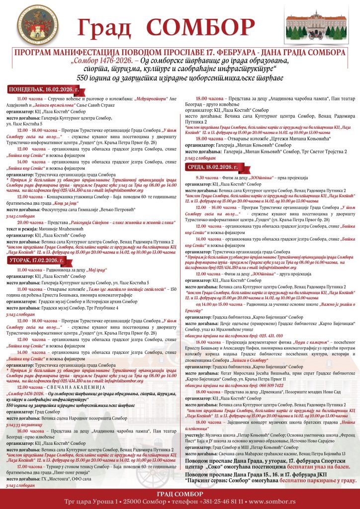 У среду, 18. фебруара, поводом Дана града Културни Центар „Лаза Костић“ у Великој сали у терминима 9.30 и 12 часова организоваће пројекцију филма за децу „ЗООтопија“, а бесплатне карте могу се преузети на билетарници КЦ „Лаза Костић“ 12. и 13. фебруара од 15.00 до 20.00 часова и 14.02. од 10.00 до 13.00 часова. Градска Библиотека „Карло Бијелицки“ од 14 до 15 часова организује радионицу за ученике основне школе „Важно је знати о Ернесту“а заинтересовани треба да се пријаве на телефонски број: 025 431 010 , а од 18 часова у Легату „Мирослава Јосића Вишњића“ одржаће се пројекција документарног филма „Људи с камером“ – посвећеног Ернесту Бошњаку и Александру Лифки, пионирима кинематографије уз пратећи програм изложбу корица издања Градске библиотеке посвећених култури, историји и споменицима Сомбора „Записи о Сомбору“ заинтересовани за ове садржаје треба да се пријаве на телефонски број: 066 509 7422. Од 18 часова у Великој сали Културног центра „Лаза Костић“ одиграће се представа Црвенкапа“, Позориште младих Нови Сад, а бесплатне карте се преузимају на билетарници КЦ „Лаза Костић“ 12. и 13. фебруара од 15.00 до 20.00 часова и 14.02. од 10.00 до 13.00 часова. Такође од 18 часова, одржаће се заједнички концерт музичких школа братских градова „Нотна плетеница“ у ком учествују: Музичка школа „Петар Коњовић“ Сомбор; Основна уметничка школа „Ференц Лист“ Баја и ЈУ школа за основно музичко образовање, Источно Ново Сарајево. Концерт ће се одржати у Свечаној сали Мађарске грађанске касине, а улаз је слободан за све посетиоце.
