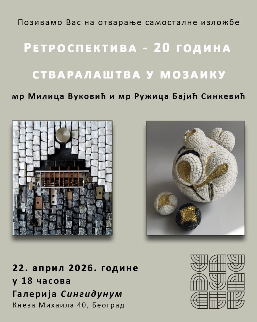 Ретроспективна изложба – 20 година стваралаштва у мозаику: Милица Вуковић и Ружица Бајић-Синкевић организује се у Галерији „Сингидунум“ у периоду од 22. до 30. априла 2026. године.
