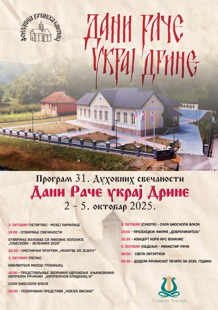 У недељу, 05. октобра, након Свете литургије у манастиру Рача, биће уприличен и најзначајнији догађај манифестације, свечана додела Рачанског печата за 2025. годину.